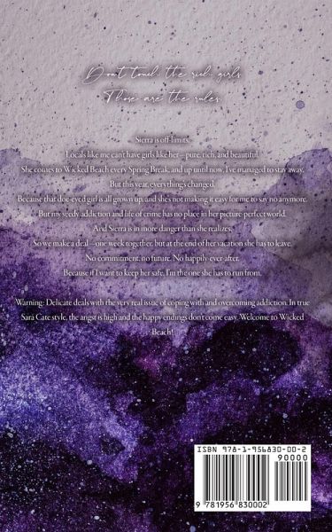 Don't touch the rich girls. Those are the rules. Sierra is off-limits. Locals like me can't have girls like her-pure, rich, and beautiful. She comes to Wicked Beach every Spring Break, and up until now, I've managed to stay away. But this year, everything's changed. Because that doe-eyed girl is all grown up, and she's not making it easy for me to say no anymore. But my seedy addiction and life of crime has no place in her picture-perfect world. And Sierra is in more danger than she realizes. So we make a deal-one week together, but at the end of her vacation she has to leave. No commitment, no future. No happily-ever-after. Because if I want to keep her safe, I'm the one she has to run from. Warning: Delicate deals with the very real issue of coping with and overcoming addiction. In true Sara Cate style, the angst is high and the happy endings don't come easy. Welcome to Wicked Beach.