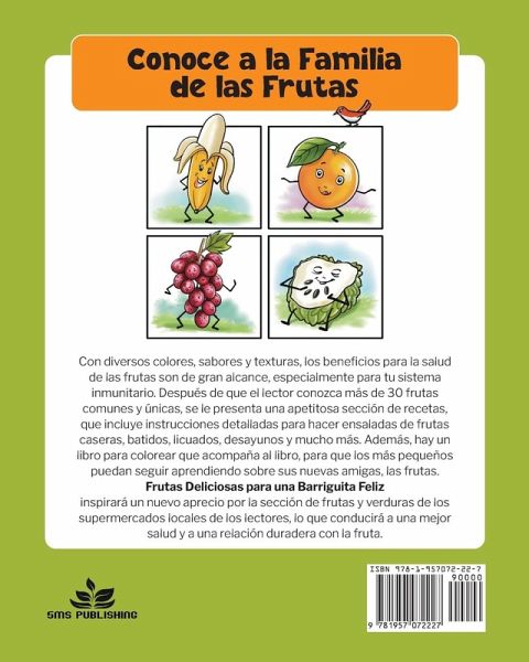 A todo el mundo le gusta picar, pero no todo el mundo sabe que los snacks pueden ser saludables. Existen opciones nutritivas y deliciosas. Como los niños son más propensos a inclinarse por las golosinas azucaradas, este libro, dirigido a los lectores más jóvenes, les mostrará que existen mejores opciones. Conoce a la Familia de las Frutas. Las frutas son partes comestibles de plantas y árboles. Con diversos colores, sabores y texturas, los beneficios de las frutas para la salud son de gran alcance, especialmente para tu sistema inmunitario. En este libro ingenioso e informativo, los lectores aprenderán qué fruta concreta es útil para cada parte o sistema específico del cuerpo, como la salud cardiaca, la prevención del cáncer, la digestión, la función cerebral y mucho más. Cada fruta se presenta en una narración en primera persona, agrupada en categorías basadas en el color. Los lectores descubrirán nuevos datos sobre frutas muy conocidas, como el melón, las uvas y las manzanas. También se familiarizarán con frutas que pueden ser nuevas para ellos, como la atemoya, la chirimoya y la guanábana, de Sudamérica. Las frutas describen su textura, qué vitaminas ofrecen, dónde pueden encontrarse y qué partes del cuerpo sustentan. Tras conocer más de 30 frutas comunes y únicas, se presenta a los lectores una apetitosa sección de recetas, que incluye instrucciones detalladas para preparar ensaladas de frutas, batidos, licuados, desayunos y mucho más. Este libro divertido, único y fácil de digerir invita a los lectores a conocer la amplia y variada Familia de las Frutas. Además, se acompaña de un libro para colorear, para que los más pequeños puedan seguir aprendiendo sobre sus nuevos amigos frutales. Deliciosas frutas para una barriguita feliz inspirará un nuevo aprecio por la sección de frutas y verduras de los supermercados locales de los lectores, lo que conducirá a una relación duradera con la fruta y a una mejor salud.