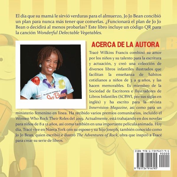 El día que su mamá le sirvió verduras para el almuerzo, Jo Jo Bean concibió un plan para nunca más tener que comerlas. ¿Funcionará el plan de Jo Jo Bean o decidirá al menos probarlas? Este libro incluye un código QR para la canción Wonderful Delectable Vegetables. Jo Jo Bean comes up with a plan to avoid eating veggies for good. Will Jo Jo Bean become the reigning champion of this mealtime war? Or will he at least give veggies a try? Geared for children ages 3 to 8, this humorous book includes a scannable QR Music Code and is just what parents need for the reluctant picky eater. Named as one of the best children's picture books that positively affirm African-American boys' daily experiences by Ciara L. Hill, licensed therapist and contributing writer for www.shepherd.com.
