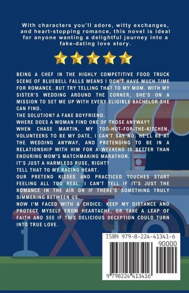 Being a chef in the highly competitive food truck scene of Bluebell Falls means I don't have much time for romance. But try telling that to my mom. With my sister's wedding around the corner, she's on a mission to set me up with every eligible bachelor she can find. The solution? A fake boyfriend. (Where can I find one of those anyway?) When Chase Martin, my too-hot-for-the-kitchen boss, volunteers to be my date, I can't say no. He'll be at the wedding anyway, and pretending to be in a relationship with him for a weekend is better than enduring Mom's matchmaking marathon. It's just a harmless ruse, right? (Tell that to my racing heart.) Our pretend kisses and practiced touches feel real to me. I can't tell if it's just the romance in the air or if there's something truly simmering between us. Now I'm faced with a choice: keep my distance and protect myself from heartache, or take a leap of faith and see if this delicious deception could turn into true love.