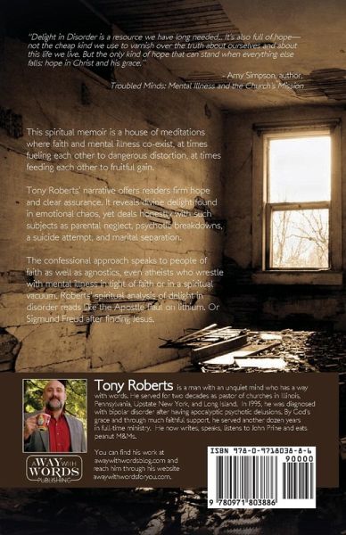 Delight in Disorder is the story of one pastor's battle with bipolar disorder. This spiritual memoir is a house of meditations where faith and mental illness co-exist, at times fueling each other to dangerous distortion, at times feeding each other to fruitful gain. It offers hope for those often neglected and shunned. It also fosters compassion for believers towards those with troubled minds.