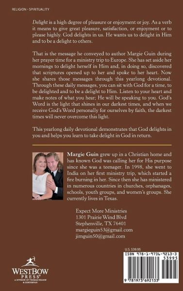 Delight is a high degree of pleasure or enjoyment or joy. As a verb it means to give great pleasure, satisfaction, or enjoyment or to please highly. God delights in us. He wants us to delight in Him and to be a delight to others. That is the message he conveyed to author Margie Guin during her prayer time for a ministry trip to Europe. She has set aside her mornings to delight herself in Him and, in doing so, discovered that scriptures opened up to her and spoke to her heart. Now she shares those messages through this yearlong devotional. Through these daily messages, you can sit with God for a time, to be delighted and to be a delight to Him. Listen to your heart and make notes of what you hear; He will be speaking to you. God's Word is the light that shines in our darkest times, and when we receive God's Word personally for ourselves by faith, the darkest times will never overcome this light. This yearlong daily devotional demonstrates that God delights in you and helps you learn to take delight in God in return.