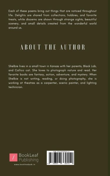Each of these poems bring out things that are noticed throughout life. Delights are shared from collections, hobbies, and favorite treats, while discerns are shown through strange sights, beautiful scenery, and small details created from the wonderful world around us.