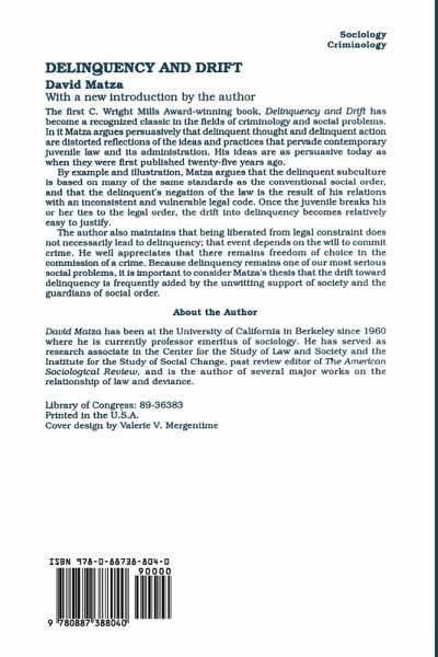 The first C. Wright Mills Award-winning book, Delinquency and Drift has become a recognized classic in the fields of criminology and social problems. In it, Matza argues persuasively that delinquent thought and delinquent action are distorted reflections of the ideas and practices that pervade contemporary juvenile law and its administration. His ideas are as persuasive today as when they were first published twenty-five years ago.
