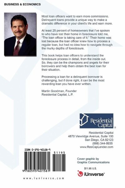 Most loan officers want to earn more commissions. Delinquent loans provide a unique way to make a dramatic difference in your client's life and earn more. At least 25 percent of the homeowners that I've spoken to who have lost their home in foreclosure told me, "The loan officer is taking care of it." Their home was lost because the loan officer knew how to process a regular loan, but had no idea how to navigate through the murky depths of foreclosure. This book helps loan officers to understand the foreclosure process in detail, from the inside out. So, they can be the champions and angels for their borrowers and help them obtain the best loan for their situation. Processing a loan for a delinquent borrower is challenging. But if done right, it can be the most rewarding loan you have ever written. Martin Goodman, Founder Residential Capital, L.P.