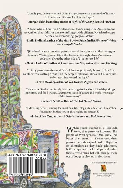 When you're trapped in a Rust Belt town, time passes or it doesn't. The people of Westinghouse, Ohio know this better than most. In Delinquents, their personal worlds expand and collapse in on themselves as they battle addictions, build scrap-metal rocket ships, and tether themselves to plans that will either get them out of dodge or blow up in their faces. A former Deadhead seeks sobriety in his hometown, though his decades-old childhood trauma has been exhumed and now awaits him. A sometimes-recovering addict asks his younger sister to put him up as he repairs cars in their yard and she scrabbles to keep her own sanity. A woman intending to follow her boyfriend out of town wonders why a newcomer in Westinghouse has captured her latent interest. Nick Rees Gardner's linked stories portray people as they are: alternately hilarious, desperate, resilient, broken. For the characters contained in Delinquents, the crux is determining which they'll be when the music stops.