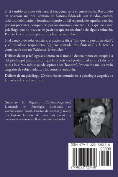 Si el cambio de roles existiera, el terapeuta sería el entrevistado. Recostado en posición analítica, contaría su historia fabricada con miedos, errores, aciertos, debilidades y fortalezas; siendo difícil separarla de aquellas vertidas por sus pacientes, compuestas por los mismos elementos. Y es que no existe psicólogo que no titubee, ni paciente que no sea dueño de alguna solución. Por eso las certezas se prestan… y las dudas también. Si el cambio de roles existiera, el paciente diría "¿En qué lo puedo ayudar?", y el psicólogo respondería "Quiero contarle mis fantasías" y la terapia comenzaría con un "Adelante, lo escucho…" Delirios de un psicólogo se adentra en el mundo de una mente en terapia (la del psicólogo) para mostrar que la objetividad profesional es una falacia; y que, a lo sumo, sólo se puede aspirar a ser "honesto". Por eso los análisis están cargados de subjetividad... y los consejos, también. Delirios de un psicólogo, 20 historias del mundo de la psicología cargadas de fantasía y de crudo realismo.