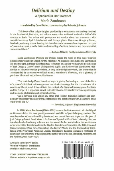 Written by one of twentieth-century Spain's most prominent intellectuals, this book-part memoir, part lyrical novel-is both a Bildungsroman about a young woman's intellectual formation during a crucial period of Spanish history (1929-1931) and a philosophical meditation upon the individual's place in society. Maria Zambrano's Delirium and Destiny makes the work of this major Spanish philosopher available in English for the first time. An excellent introduction to Zambrano's life and thought, it traces the intellectual formation of a young woman who became one of Jose Ortega y Gasset's most distinguished pupils, and it chronicles Zambrano's redefinition of his philosophical positions. A truly interdisciplinary work, this translation is accompanied by an extensive critical essay, a translator's afterword, and a glossary of pertinent historical and philosophical terms.