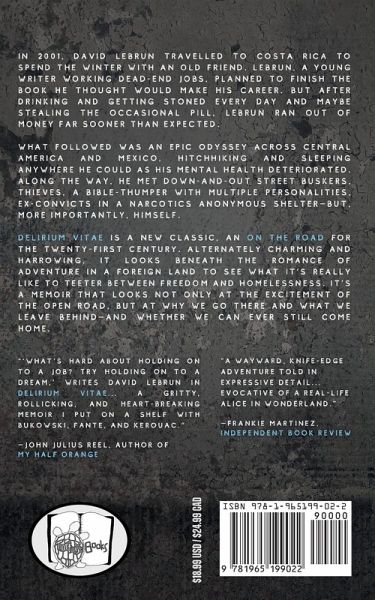 In 2001, David LeBrun travelled to Costa Rica to reconnect with an old friend. LeBrun, a young writer at the end of a string of dead-end jobs, planned on living cheaply for a winter while finishing the book he thought would make his career. (And, of course, drinking every night and getting stoned every day. And maybe stealing the occasional pill.) But once there, he was swept up in his friend’s self-destruction and ran out of money far sooner than expected. What followed was an epic odyssey across Central America and Mexico, hitchhiking with random strangers and sleeping anywhere he could as his mental health deteriorated and he tried to finish his book; along the way, he met down-and-out street buskers, a narcissistic thief, a Bible-thumper with multiple personalities, ex-convicts in a Narcotics Anonymous shelter—but, more importantly, himself. Delirium Vitae is a new classic, an On the Road for the twenty-first century. Alternately charming and harrowing, it looks beneath the romance of adventure in a foreign land to see what it’s really like to teeter between freedom and homelessness. (Because, let’s be honest, walking thirty-six kilometers on an empty stomach, or fending off a sweaty and shirtless truck driver, does suck.) It’s a fantastic book that looks not only at the excitement of the open road, but at why we go there, and what we leave behind—and whether we can ever still come home.