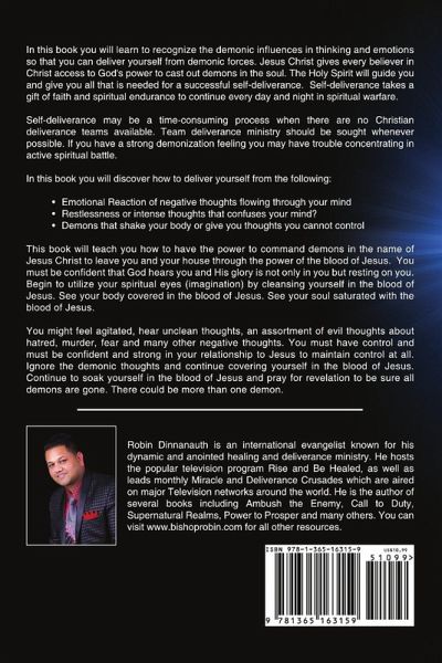 This book will teach you how to have the power to command demons in the name of Jesus Christ to leave you and your house through the power of the blood of Jesus. You must be confident that God hears you and His glory is not only in you but resting on you. Begin to utilize your spiritual eyes (imagination) by cleansing yourself in the blood of Jesus. See your body covered in the blood of Jesus. See your soul saturated with the blood of Jesus. You might feel agitated, hear unclean thoughts, an assortment of evil thoughts about hatred, murder, fear and many other negative thoughts. You must have control and must be confident and strong in your relationship to Jesus to maintain control at all. Ignore the demonic thoughts and continue covering yourself in the blood of Jesus. Continue to soak yourself in the blood of Jesus and pray for revelation to be sure all demons are gone. There could be more than one demon.