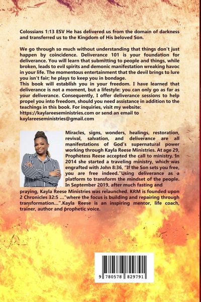 Colossians 1:13 ESV He has delivered us from the domain of darkness and transferred us to the Kingdom of His beloved Son. We go through so much without understanding that things don't just happen by coincidence. Deliverance 101 is your foundation for deliverance. You learn that submitting to people and things, while broken, leads to evil spirits and demonic manifestation wreaking havoc in your life. The momentous entertainment that the devil brings to lure you isn't fair; he plays to keep you in bondage. This book will establish your freedom. I have learned that deliverance is not a moment, but a lifestyle: you can only go as far as your deliverance. I offer deliverance sessions to help propel you into freedom, should you need help besides the teachings in this book. For inquiries, visit my website: https://kaylareeseministries.com or email kaylareeseministries@gmail.com