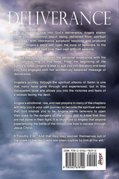 In this powerful look into God's deliverance, Angela shares a personal testimony about being delivered from spiritual darkness. With informative scriptural teaching and profound insight, Angela's story will open the eyes of believers to the incredible hand of God over their own difficult seasons. Angela beautifully balances the personal experience with the spiritual teaching in this book. From the beginning of the author's notes, Angela is able to pull you into the story and keep you fully engaged with her wonderfully balanced message of deliverance. Angela's journey through the spiritual attacks of Satan is one that many have gone through and experienced, but in this transparent book she allows you into the victories and fears of a woman facing the devil. Angela's emotional, raw, and real prayers in many of the chapters will help you in your own journey to become the spiritual warrior that God intends you to be. Angela wants believers to open their eyes to the dangers of the enemy and to know that they are not alone in their fight. It is important to Angela that anyone experiencing the battle of the mind know how to escape through Jesus Christ. II Timothy 2:26 "And that they may recover themselves out of the snare of the devil, who are taken captive by him at his will."