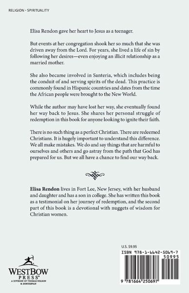 Elisa Rendon gave her heart to Jesus as a teenager. But events at her congregation shook her so much that she was driven away from the Lord. For years, she lived a life of sin by following her desires-even enjoying an illicit relationship as a married mother. She also became involved in Santeria, which includes being the conduit of and serving spirits of the dead. This practice is commonly found in Hispanic countries and dates from the time the African people were brought to the New World. While the author may have lost her way, she eventually found her way back to Jesus. She shares her personal struggle of redemption in this book for anyone looking to ignite their faith. There is no such thing as a perfect Christian. There are redeemed Christians. It is hugely important to understand this difference. We all make mistakes. We do and say things that are harmful to ourselves and others and go astray from the path that God has prepared for us. But we all have a chance to find our way back.