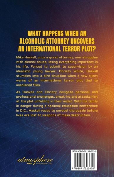 What happens when an alcoholic attorney uncovers an international terror plot? Mike Haskell, once a great attorney, now struggles with alcohol abuse, losing everything important in his life. Forced to submit to supervision by an idealistic young lawyer, Christy White, Haskell stumbles into a dire situation when a new client warns of an international terror plot tied to misplaced files. As Haskell and Christy navigate personal and professional challenges, break-ins and attacks hint at the plot unfolding in their midst. With his family in danger during a national education conference in D.C., Haskell races to unravel the puzzle before lives are lost to weapons of mass destruction.