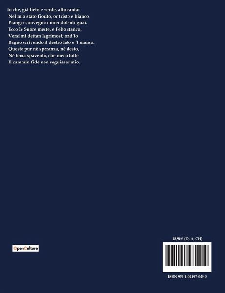 Io che, già lieto e verde, alto cantai Nel mio stato fiorito, or tristo e bianco Pianger convegno i miei dolenti guai. Ecco le Suore meste, e Febo stanco, Versi mi dettan lagrimosi; ond¿io Bagno scrivendo il destro lato e ¿l manco. Queste pur nè speranza, nè desio, Nè tema spaventò, che meco tutte Il cammin fide non seguisser mio.