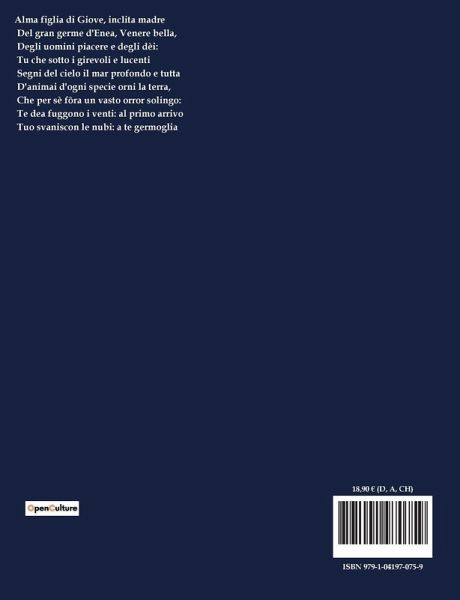 Alma figlia di Giove, inclita madre Del gran germe d'Enea, Venere bella, Degli uomini piacere e degli dèi: Tu che sotto i girevoli e lucenti Segni del cielo il mar profondo e tutta D'animai d'ogni specie orni la terra, Che per sè fôra un vasto orror solingo: Te dea fuggono i venti: al primo arrivo Tuo svaniscon le nubi: a te germoglia