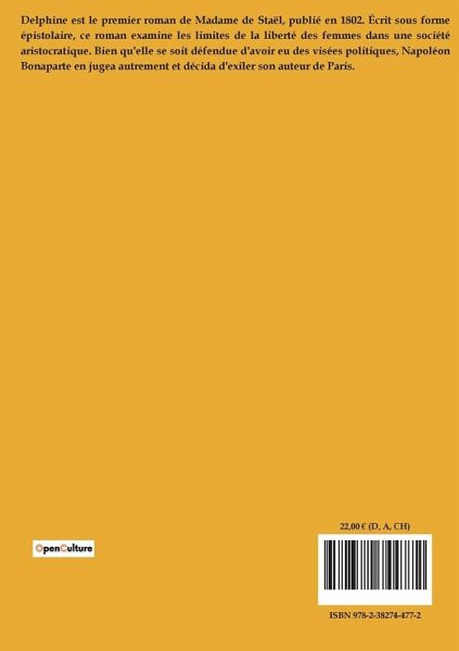 Delphine est le premier roman de Madame de Staël, publié en 1802. Écrit sous forme épistolaire, ce roman examine les limites de la liberté des femmes dans une société aristocratique. Bien qu'elle se soit défendue d'avoir eu des visées politiques, Napoléon Bonaparte en jugea autrement et décida d'exiler son auteur de Paris.