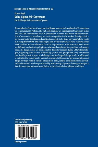 The emphasis of this book is on practical design aspects for broadband A/D converters for communication systems. The embedded designs are employed for transceivers in the field of ADSL solutions and WLAN applications. An area- and power-efficient realization of a converter is mandatory to remain competitive in the market. The right choice for the converter topology and architecture needs to be done very carefully to result in a competitive FOM. The book begins with a brief overview of basic concepts about ADSL and WLAN to understand the ADC requirements. At architectural level, issues on different modulator topologies are discussed employing the provided technology node. The design issues are pointed out in detail for modern digital CMOS technologies, beginning with 180nm followed by 130nm and going down to 65nm feature size. Beside practical aspects, challenges to mixed-signal design level are addressed to optimize the converters in terms of consumed chip area, power consumptionand design for high yield in volume production. Thus, careful considerations on circuit- and architectural- level are performed by introducing a dynamic-biasing technique, a feed-forward approach and a resolution in time instead of amplitude resolution.