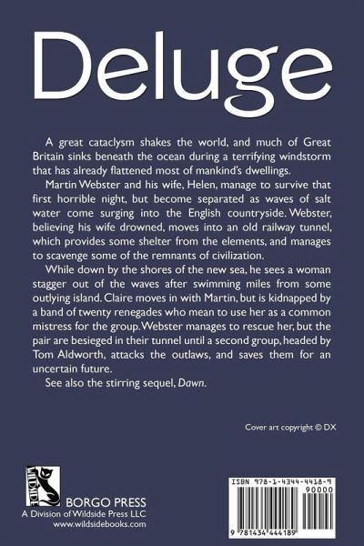 A great cataclysm shakes the world, and much of Great Britain sinks beneath the ocean during a terrifying windstorm that has already flattened most of mankind's dwellings. Martin Webster and his wife, Helen, manage to survive that first horrible night, but become separated as waves of salt water come surging into the English countryside. Webster, believing his wife drowned, moves into an old railway tunnel, which provides some shelter from the elements, and manages to scavenge some of the remnants of civilization. While down by the shores of the new sea, he sees a woman stagger out of the waves after swimming miles from some outlying island. Claire moves in with Martin, but is kidnapped by a band of twenty renegades who mean to use her as a common mistress for the group. Webster manages to rescue her, but the pair are besieged in their tunnel until a second group, headed by Tom Aldworth, attacks the outlaws, and saves them for an uncertain future. See also the stirring sequel, Dawn.