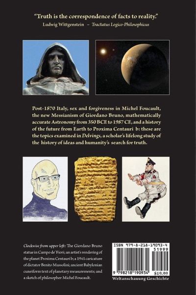 I have been interested in France and Italy as well as in the Ancient Greek and Middle Eastern worlds since I was old enough to pour over my grandparents' old encyclopedia and my own Landmark illustrated history books. Like many kids in the '50s, I used to watch Flash Gordon on TV and dream about humans exploring other places in the universe. And I even loved algebra, geometry, and trigonometry in high school. These various interests, all from my youth in the fifties and sixties, have stuck with me in one way or another, and they developed into my vocation as a historian, where I didn't need intergalactic tights, a ray gun, or even a slide rule for the exploration of a universe of ideas and the never-ending battle against the enemy of misinformation. The first of the six chapters of which Delvings is comprised discusses the problem of creating a unified Italian peninsula and people. The next chapter focuses on two important and transformative French historians of the twentieth century, Emmanuel Le Roy Ladurie and Michel Foucault. The third chapter is about a sixteenth-century Italian philosopher, Giordano Bruno, who was burned at the stake in 1600 because he had proclaimed himself to be the one true Messiah of the infinite number of worlds in the infinite universe. While these chapters focus on Italy and French and Italian thinkers, the chapter which follows them describes how accurate, mathematical astronomy has existed since the time of the late Mesopotamians (ca. 350 BCE) to the time of Einstein's Theory of Special Relativity (1905 CE). The last chapter before the Post Scriptum will discuss, almost in the fashion of Jules Verne, the necessity of humans to relocate in about one hundred years from now to a far-off exoplanet because of the Climate Change disasters on our Earth.