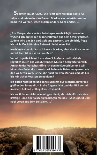 Sommer im Jahr 2000. Die Fahrt zum Nordkap soll für Julius und seinen besten Freund Markus ein unbekümmerter Roadtrip werden. Doch es kommt anders. Ganz anders. ..."Am Morgen des vierten Reisetages werde ich jäh von einer wütend schimpfenden Männerstimme aus dem Schlaf gerissen. Zudem wird am Zelt gerüttelt und gezogen. Wo bin ich?, frage ich mich, doch für eine Antwort bleibt keine Zeit.Noch im Halbschlaf taste ich nach Markus, aber der Platz neben mir ist leer. Ist er das da draußen? Verwirrt quäle ich mich aus dem Schlafsack und krabbele zögerlich durch das von dutzenden Mücken belagerte Vorzelt. Am Ende des Vorzeltes öffne ich den Reißverschluss und will hinaus ins Freie. Doch zwei stark behaarte Beine versperren mir den weiteren Weg. Beine, die nicht die von Markus sind, da bin ich mir sicher. Wessen Beine dann? Ich blicke nach oben und sehe zunächst nur Mensch, bevor mir gleißendes Sonnenlicht in die Augen sticht und das Bild vor mir in einem hellen Lichtkegel verschwindet.Ich weiß daher nicht, wie mir geschieht, als mich plötzlich eine kräftige Hand am rückseitigen Kragen meines T-Shirts packt und Kopf voran aus dem Zelt zieht. ..."