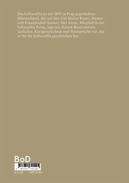 Die Schlaraffia ist ein 1859 in Prag gegründeter Männerbund, der auf den drei Säulen Kunst, Humor und Freundschaft basiert. Der Autor, Mitglied in der Schlaraffia Peine, legt mit diesem Band weitere Gedichte, Kurzgeschichten und Sinnsprüche vor, die er für die Schlaraffia geschrieben hat.