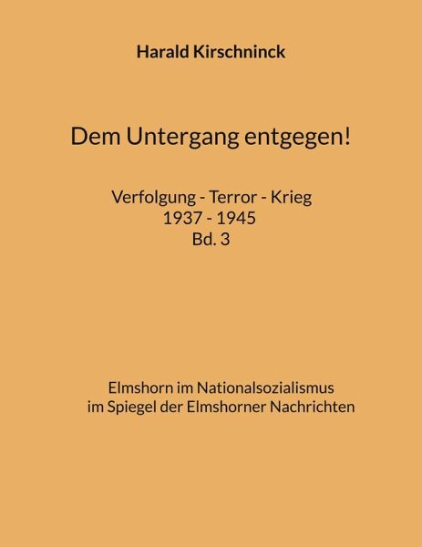 Mit dem dritten Band "Dem Untergang entgegen! Verfolgung - Terror - Krieg" wird die Reihe "Nationalsozialismus in Elmshorn im Spiegel der "Elmshorner Nachrichten" abgeschlossen. Er behandelt die Jahre 1937 bis 1945, die gekennzeichnet waren mit Ausgrenzung und Verfolgung der jüdischen Mitbürger, der Unterdrückung mit Terror, dem Krieg, der sehr schnell von anfänglichen Erfolgen in den Untergang führte. In diesem Krieg wurde der Holocaust an Juden, die Misshandlungen, Ausbeutungen und Morde an Kriegsgefangenen aus den unterdrückten Ländern Europas und Zwangsarbeitern verübt. In diesem Buch wird die Zeit des Nationalsozialismus und der Alltag im Krieg und dessen Vorbereitung in Elmshorn anhand von Quellen aus Archiven, Polizeiakten und Zeitungsauschnitten aus den Elmshorner Nachrichten beschrieben, wobei chronologisch vorgegangen wurde.