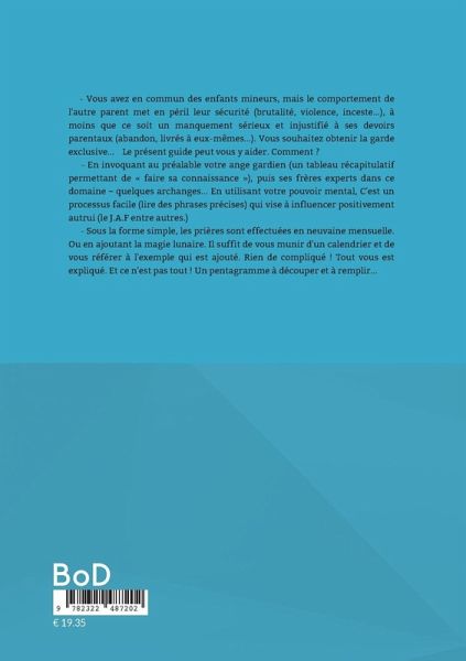 À titre d'information : ce livre ne concerne que les cas où la protection des enfants par rapport à l'autre parent est justifiée ! Vous avez en commun des enfants mineurs ou préadultes, mais le comportement de l'autre parent met en péril leur sécurité (brutalité, violence, inceste...), à moins que ce soit un manquement sérieux et injustifié à ses devoirs parentaux (abandon, livrés à eux-mêmes...). Vous souhaitez obtenir la garde exclusive.Petite précision :- Si votre cas ne relève que d'un désaccord concernant la garde partagée, c'est cet autre livre qu'il vous faut. Son titre : Droits parentaux.... obtenez satisfaction grâce à la Justice Divine ! ISBN : 9782322456529...Ou, vous avez été déchu.e de vos droits pour motif grave, mais vous demandez à les rétablir : ... il vous faut : « récupérer l'autorité parentale & droit de garde.... » ISBN : 9782322487141C'est bien celui-ci qu'il vous faut ? Alors la contenance de ce manuel vous permettra d'augmenter vos chances d'obtenir gain de cause !C'est bien celui-ci qu'il vous faut ? Alors Le contenu du présent guide peut vous y aider.Comment ? 1/ en invoquant au préalable votre ange gardien (un tableau récap. permet de « faire sa connaissance »), puis ses frères experts de la protection et de la libération des persécuteurs entre autres.2/ Vous solliciterez également quelques archanges et esprits de la nature sans oublier (si cela fait partie de votre religion) d'invoquer les saints, agissant contre la vengeance d'autrui et permettant d'obtenir la victoire dans un procès contre les ennemis.3/ D'un autre côté, une technique facile mais efficace pour vous permettre de déployer votre puissance mentale, et ainsi être capable d'agir indirectement par télépathie. C'est un procédé simple (lire des phrases spécifiques) qui vise à influencer positivement les autres (J.A.F entre autres) mais aussi, en agissant comme un bouclier de protection.Sous la forme simple, les prières sont effectuées en neuvaine.4/ mais pour ceux qui souhaitent ajouter un peu de « magie lunaire » à leur demande, un paragraphe spécial « prier en fonction de la lune » vous est proposé. Il suffit de vous munir d'un calendrier de l'année en cours (et/ou à venir) avec les lunes indiquées, et de vous référer au « calendrier exemple » qui est ajouté.Rien de compliqué ! Tout vous est expliqué.Et ce n'est pas tout !5/ en fin de volume, vous trouverez un pentagramme à découper et à remplir.Rituels simples mais très efficaces !