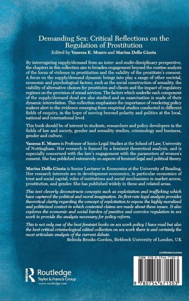 Introduction Editors' Introduction Vanessa E.Munro Marina DellaGiusta; Chapter 1 Legal Incursions into Supply/Demand JaneScoular MaggieO'Neill; Chapter 2 Be Helped or Else! Economic Exploitation Male Violence and Prostitution Policy in the UK JoPhoenix; Chapter 3 Wolfenden 50 SophieDay; Chapter 4 The Construction of Prostitutes and Clients in French Policy Debates GillAllwood; Chapter 5 Exploring Exploitation Vanessa E.Munro; Chapter 6 Putting Trafficking on the Map Sharron A. FitzGeraldMunro; Chapter 7 Simulating the Impact of Regulation Changes on the Market for Prostitution Services Marina DellaGiusta; Chapter 8 Client Participation and the Regulatory Environment AlanCollins GuyJudge; Chapter 9 Criminalising the Use of Trafficked Prostitutes DavidArchard; Chapter 10 Why Hate Men who Pay for Sex? Exploring the Shift to 'Tackling Demand' in the UK TeelaSanders RosieCampbell; Chapter 11 The Consumer the Consumed and the Commodity MadeleineCoy;