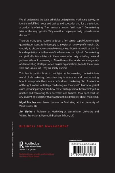 This is the first book to cast light on the secretive, counterintuitive world of de-marketing: a process whereby a company actively, for whatever reasons, tries to decrease demand of its product. Via insightful case studies from a selection of thought leaders, this book deconstructs de-marketings mysteries and demonstrates how to incorporate them into a profit-driven marketing plan.