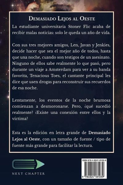 La estudiante universitaria Stoner Flic acaba de recibir malas noticias: solo le queda un año de vida. Con sus tres mejores amigos, Len, Javan y Jenkies, decide hacer que sea el mejor año de todos, hasta que una noche, cuando son testigos de un asesinato. Ninguno de ellos sabe realmente lo que pasó, pero durante un viaje a Amsterdam para ver a su banda favorita, Tenacious Toes, el cantante principal les dice que usen drogas para reconstruir sus recuerdos de esa noche. Lentamente, los eventos de la noche brumosa comienzan a desmoronarse. Pero, ¿qué sucedió realmente? ¿Existe una conexión entre ellos y la víctima? Esta es la edición en letra grande de Demasiado Lejos al Oeste, con un tamaño de fuente / tipo de fuente más grande para facilitar la lectura.