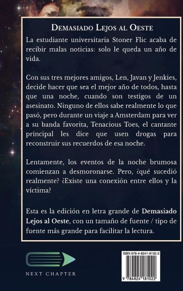 La estudiante universitaria Stoner Flic acaba de recibir malas noticias: solo le queda un año de vida. Con sus tres mejores amigos, Len, Javan y Jenkies, decide hacer que sea el mejor año de todos, hasta que una noche, cuando son testigos de un asesinato. Ninguno de ellos sabe realmente lo que pasó, pero durante un viaje a Amsterdam para ver a su banda favorita, Tenacious Toes, el cantante principal les dice que usen drogas para reconstruir sus recuerdos de esa noche. Lentamente, los eventos de la noche brumosa comienzan a desmoronarse. Pero, ¿qué sucedió realmente? ¿Existe una conexión entre ellos y la víctima? Esta es la edición en letra grande de Demasiado Lejos al Oeste, con un tamaño de fuente / tipo de fuente más grande para facilitar la lectura.