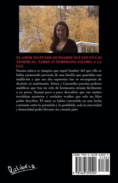 EL AMOR NO PUEDE QUEDARSE OCULTO EN LAS TINIEBLAS, TARDE O TEMPRANO SALDRA A LA LUZ Susana núnca se imagino que aquel hombre del que ella se habia enamorado provenia de una familia que guardaba una maldición y que sus dos supuestas tias se encargarian de destruir su matrimonio. Irinea y Cassandra poseian poderes maléficos que tras un velo de hermosura atraian fácilmente a su presa. Susana poco a poco descubrio que sus sueños revelaban misterios y verdades ocultas que solo un libro podia descifrar. El amor se habia convertido en una lucha constante entre lo permitido y lo prohibido, solo la sinceridad y honestidad podia llevarse un corazón púro.
