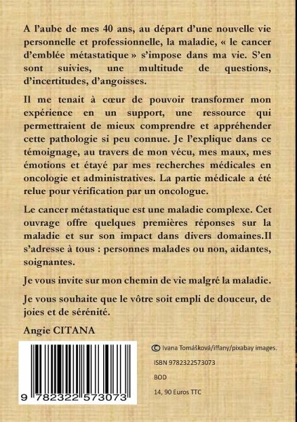 Cet ouvrage est à la fois un témoignage et un outil pratique, riche en informations médicales (relues par un oncologue) et en renseignements administratifs, destiné à aider tout lecteur à mieux comprendre le cancer métastatique et ses implications pour la personne malade et ses aidants. Un livre grand public pour transmettre, soutenir et expliquer simplement le parcours d'Angie et de bien d'autres.