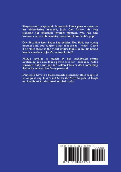 Sixty-year-old respectable housewife Paula plots revenge on her philandering husband, Jack. Can Arlene, his long standing old fashioned feminist mistress, who has now become a carer with benefits, rescue him from Paula's grip? One Brazilian later Paula has bedded Hot Rod, her young internet date, and subjected her husband to ...what? Could it be elder abuse as the social worker thinks or are the bound hands a product of Jack's confused mind? Paula's revenge is fuelled by her unexpected sexual awakening and new found power over her husband. Will a surrogate baby and gay son soften Paula or does something darker lie beneath her frosty persona? Demented Love is a black comedy presenting older people in an original way. It is S and M for the M&S brigade. A laugh out loud book for the broad minded reader