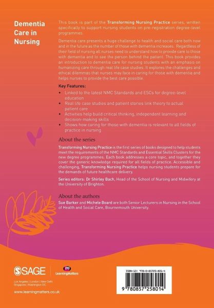 Dementia care presents a huge challenge to health and social care both now and in the future. The number of those in the UK with dementia is expected to increase to 1.4 million in the next 30 years. Regardless of the field of nursing, all nurses need to understand the experiences of a person with dementia and the issues related to their care. This book provides an introduction to dementia care for nursing students with an emphasis on humanizing care. Real life case studies show the person behind the patient and explore the ethical dilemmas that a nurse may face.
