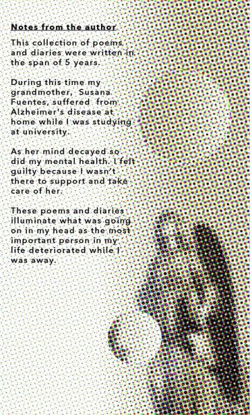 This collection of poems and diaries was written in the span of five years. During this time, my grandmother, Susana Fuentes suffered from Alzheimer's disease at home while I was studying at university. As her mind decayed, so did my mental health. I felt guilty because I wasn't there to support or help her. These poems and diaries illuminate what was going on in my head as the most important person in my life deteriorated while I was away.