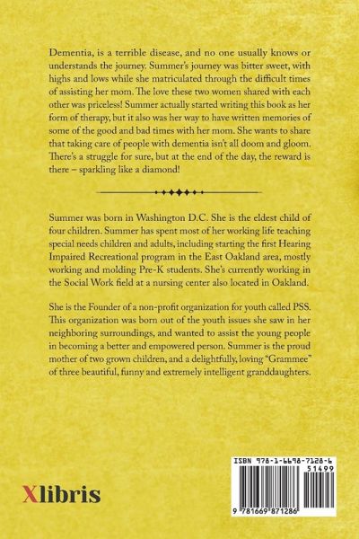Dementia, is a terrible disease, and no one usually knows or understands the journey. Summer's journey was bitter sweet, with highs and lows while she matriculated through the difficult times of assisting her mom. The love these two women shared with each other was priceless! Summer actually started writing this book as her form of therapy, but it also was her way to have written memories of some of the good and bad times with her mom. She wants to share that taking care of people with dementia isn't all doom and gloom. There's a struggle for sure, but at the end of the day, the reward is there - sparkling like a diamond!