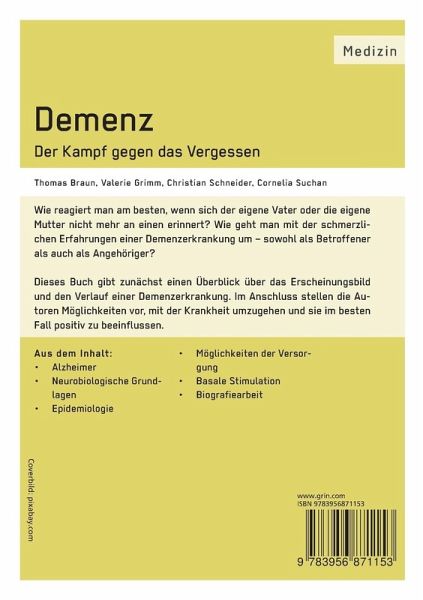Fachbuch aus dem Jahr 2014 im Fachbereich Medizin - Diagnostik, , Sprache: Deutsch, Abstract: Wie reagiert man am besten, wenn sich der eigene Vater oder die eigene Mutter nicht mehr an einen erinnert? Wie geht man mit der schmerzlichen Erfahrung einer Demenzerkrankung um - sowohl als Betroffener als auch als Angehöriger.Dieses Buch gibt zunächst einen Überblick über das Erscheinungsbild und den Verlauf einer Demenzerkrankung. Im Anschluss stellen die Autoren Möglichkeiten vor, mit der Krankheit umzugehen und sie im besten Fall positiv zu beeinflussen.Aus dem Inhalt: Alzheimer, neurobiologische Grundlagen, Epidemiologie, Möglichkeiten der Versorgung, Basale Stimulation, Biografiearbeit.