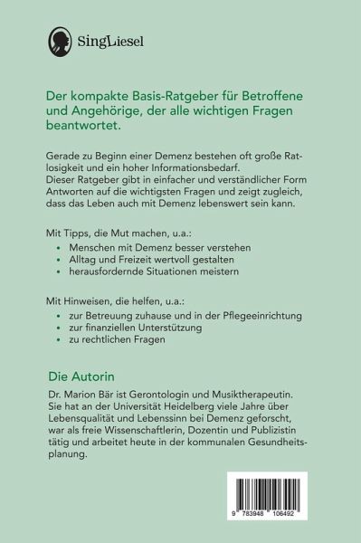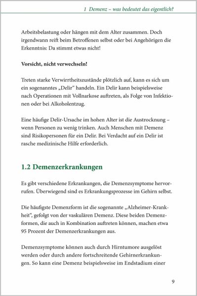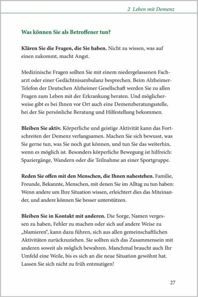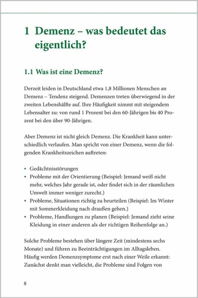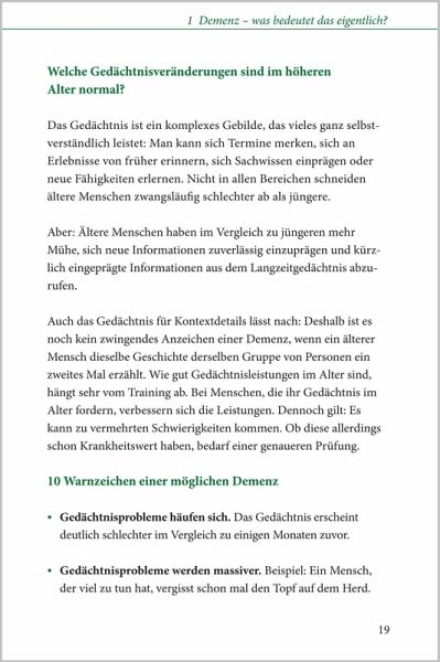 Demenz - der kompakte Ratgeber Schnelle Hilfe für Betroffene und Angehörige Der kompakte Basis-Ratgeber für Betroffene und Angehörige, der alle wichtigen Fragen beantwortet. Gerade zu Beginn einer Demenz bestehen oft große Ratlosigkeit und ein hoher Informationsbedarf. Dieser Ratgeber gibt in einfacher und verständlicher Form Antworten auf die wichtigsten Fragen und zeigt zugleich, dass das Leben auch mit Demenz lebenswert sein kann. Mit Tipps, die Mut machen, u.a.: ¿ Menschen mit Demenz besser verstehen ¿ Alltag und Freizeit wertvoll gestalten ¿ herausfordernde Situationen meistern Mit Hinweisen, die helfen, u.a.: ¿ zur Betreuung zuhause und in der Pflegeeinrichtung ¿ zur finanziellen Unterstützung ¿ zu rechtlichen Fragen