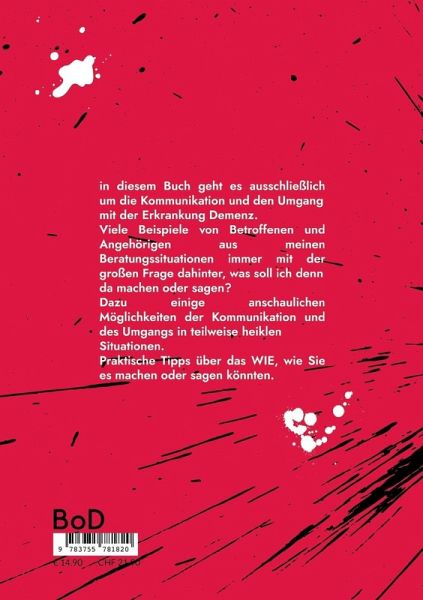 in diesem Buch geht es ausschließlich um die Kommunikation und den Umgang mit der Erkrankung Demenz.Viele Beispiele von Betroffenen und Angehörigen aus meinen Beratungssituationen immer mit der großen Frage dahinter, was soll ich denn da machen oder sagen? Dazu einige anschaulichen Möglichkeiten der Kommunikation und des Umgangs in teilweise heiklen Situationen.Praktische Tipps über das WIE, wie Sie es machen oder sagen könnten.