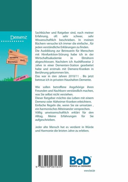 Sachbücher und Ratgeber sind, nach meiner Erfahrung, oft sehr schwer, sehr Wissenschaftlich beschrieben. In meinen Büchern versuche ich immer die einfache , für jeden verständliche Erklärungen zu finden.Die Ausbildung zur Betreuerin für Menschen mit Hirnfunktion-Störung habe ich in der Wirtschaftsakademie in Elmshorn abgeschlossen. Nachdem ich Aushilfsweise 2 Jahre in einer Dementen-Station gearbeitet habe und erstmals mit Demenz-Kranken in Berührung gekommen bin.Das war in den Jahren 2010/11 . Bis jetzt betreue ich in privaten Haushalten Demente.Wie sollen betroffene Angehörige ihren Freunden und Nachbarn verständlich machen, was Sie selbst nicht verstehen.Dieser Ratgeber möchte das Leben mit einem Demenz oder Alzheimer Kranken erleichtern.Einfache Regeln die, wenn Sie sie umsetzen, ein harmonisches Miteinander versprechen.Völlig unwissenschaftlich erklärt für den Alltag. Meine Erfahrungen für Sie aufgeschrieben.Jeder alte Mensch hat es verdient in Würde und Harmonie die letzten Jahre zu erleben.