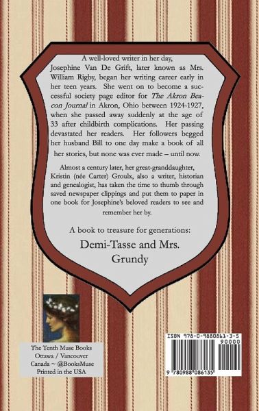 A biography and collection of stories from 1924-1927 of writer Josephine Van De Grift, columnist for the Akron Beacon Journal and reporter for the Newspaper Enterprise Association. Her column "Demi-Tasse and Mrs. Grundy" won praise from her readers nationwide. A well-loved writer in her day, Josephine Van De Grift, later known as Mrs. William Rigby, began her writing career early in her teen years. She went on to become a successful society page editor for the Akron Beacon Journal in Akron, Ohio between 1924-1927, when she passed away suddenly at the age of 32 after childbirth complications. Her passing devastated her readers. Her followers begged her husband Bill to one day make a book of all her stories, but none was ever made – until now. Almost a century later, her great-granddaughter, Kristin (née Carter) Groulx, also a writer, historian and genealogist, has taken the time to thumb through saved newspaper clippings and put them to paper in one book for Josephine’s beloved readers to see and remember her by.