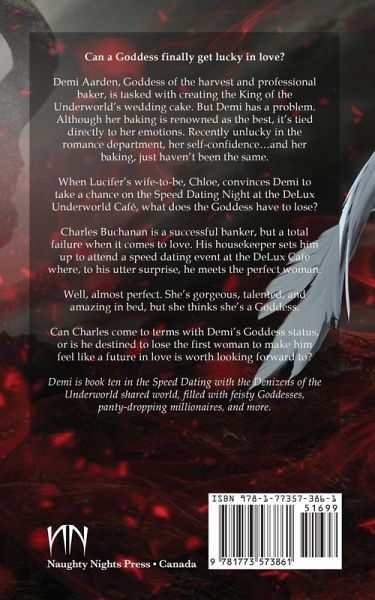 Can a Goddess finally get lucky in love? Demi Aarden, Goddess of the harvest and professional baker, is tasked with creating the King of the Underworld's wedding cake. But Demi has a problem. Although her baking is renowned as the best, it's tied directly to her emotions. Recently unlucky in the romance department, her self-confidence...and her baking, just haven't been the same. When Lucifer's wife-to-be, Chloe, convinces Demi to take a chance on the Speed Dating Night at the DeLux Underworld Café, what does the Goddess have to lose? Charles Buchanan is a successful banker, but a total failure when it comes to love. His housekeeper sets him up to attend a speed dating event at the DeLux Cafe where, to his utter surprise, he meets the perfect woman. Well, almost perfect. She's gorgeous, talented, and amazing in bed, but she thinks she's a Goddess. Can Charles come to terms with Demi's Goddess status, or is he destined to lose the first woman to make him feel like a future in love is worth looking forward to? Demi is book ten in the Speed Dating with the Denizens of the Underworld shared world, filled with feisty Goddesses, panty-dropping millionaires, and more.