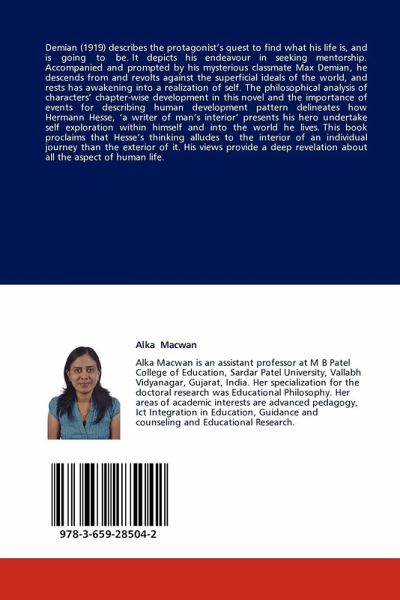 Demian (1919) describes the protagonist s quest to find what his life is, and is going to be. It depicts his endeavour in seeking mentorship. Accompanied and prompted by his mysterious classmate Max Demian, he descends from and revolts against the superficial ideals of the world, and rests has awakening into a realization of self. The philosophical analysis of characters chapter-wise development in this novel and the importance of events for describing human development pattern delineates how Hermann Hesse, a writer of man s interior presents his hero undertake self exploration within himself and into the world he lives. This book proclaims that Hesse s thinking alludes to the interior of an individual journey than the exterior of it. His views provide a deep revelation about all the aspect of human life.