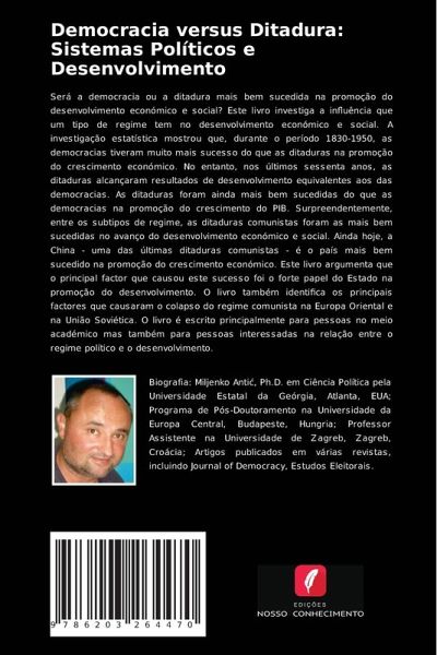 Será a democracia ou a ditadura mais bem sucedida na promoção do desenvolvimento económico e social? Este livro investiga a influência que um tipo de regime tem no desenvolvimento económico e social. A investigação estatística mostrou que, durante o período 1830-1950, as democracias tiveram muito mais sucesso do que as ditaduras na promoção do crescimento económico. No entanto, nos últimos sessenta anos, as ditaduras alcançaram resultados de desenvolvimento equivalentes aos das democracias. As ditaduras foram ainda mais bem sucedidas do que as democracias na promoção do crescimento do PIB. Surpreendentemente, entre os subtipos de regime, as ditaduras comunistas foram as mais bem sucedidas no avanço do desenvolvimento económico e social. Ainda hoje, a China - uma das últimas ditaduras comunistas - é o país mais bem sucedido na promoção do crescimento económico. Este livro argumenta que o principal factor que causou este sucesso foi o forte papel do Estado na promoção do desenvolvimento. O livro também identifica os principais factores que causaram o colapso do regime comunista na Europa Oriental e na União Soviética. O livro é escrito principalmente para pessoas no meio académico mas também para pessoas interessadas na relação entre o regime político e o desenvolvimento.