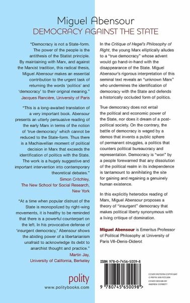 In the Critique of Hegel's Philosophy of Right, the young Marx elliptically alludes to a "true democracy" whose advent would go hand in hand with the disappearance of the state. Miguel Abensour's rigorous interpretation of this seminal text reveals an "unknown Marx" who undermines the identification of democracy with the state and defends a historically occluded form of politics. True democracy does not entail the political and economic power of the state, but it does not dream of a post-political society either. On the contrary, the battle of democracy is waged by a demos that invents a public sphere of permanent struggles, a politics that counters political bureaucracy and representation. Democracy is "won" by a people forewarned that any dissolution of the political realm in its independence, any subordination to the state, is tantamount to annihilating the site for gaining and regaining a genuinely human existence. In this explicitly heterodox reading of Marx, Miguel Abensour proposes a theory of "insurgent" democracy that makes political liberty synonymous with a living critique of domination.