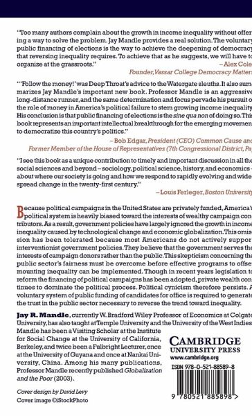 Because political campaigns in the United States are privately funded, America's political system is heavily biased toward the interests of wealthy campaign contributors. As a result, government policies have largely ignored the growth in income inequality caused by technological change and economic globalization. This omission has been tolerated because most Americans do not support interventionist government policies. They believe that the government serves the interests of the campaign donors rather than the public. This skepticism concerning the public sector's fairness must be overcome before effective programs to offset mounting inequality can be implemented. Though in recent years legislation to reform the financing of political campaigns has been adopted, private wealth continues to dominate the political process. Political cynicism therefore persists. A voluntary system of public funding of candidates for office is required to generate the trust in the public sector necessary to reverse the trend toward inequality.