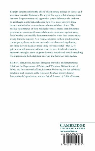 In this book, first published in 2001, Kenneth Schultz explores the effects of democratic politics on the use and success of coercive diplomacy. He argues that open political competition between the government and opposition parties influences the decision to use threats in international crises, how rival states interpret those threats, and whether or not crises can be settled short of war. The relative transparency of their political processes means that, while democratic governments cannot easily conceal domestic constraints against using force, they can also credibly demonstrate resolve when their threats enjoy strong domestic support. As a result, compared to their non-democratic counterparts, democracies are more selective about making threats, but those they do make are more likely to be successful - that is, to gain a favorable outcome without resort to war. Schultz develops his argument through a series of game-theoretic models and tests the resulting hypothesis using both statistical analyses and historical case studies.