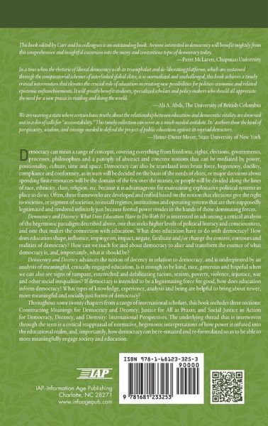 A volume in Critical Constructions: Studies on Education and Society Series Editors: Curry Stephenson Malott, West Chester University of Pennsylvania; Brad J. Porfilio, California State University, East Bay; Marc Pruyn, Monash University; and Derek R. Ford, Syracuse University Democracy can mean a range of concepts, covering everything from freedoms, rights, elections, governments, processes, philosophies and a panoply of abstract and concrete notions that can be mediated by power, positionality, culture, time and space. Democracy can also be translated into brute force, hegemony, docility, compliance and conformity, as in wars will be decided on the basis of the needs of elites, or major decisions about spending finite resources will be the domain of the few over the masses, or people will be divided along the lines of race, ethnicity, class, religion, etc. because it is advantageous for maintaining exploitative political systems in place to do so. Often, these frameworks are developed and reified based on the notion that elections give the right to societies, or segments of societies, to install regimes, institutions and operating systems that are then supposedly legitimated and rendered infinitely just because formal power resides in the hands of those dominating forces. This book is interested in advancing a critical analysis of the hegemonic paradigm described above, one that seeks higher levels of political literacy and consciousness, and one that makes the connection with education. What does education have to do with democracy? How does education shape, influence, impinge on, impact, negate, facilitate and/or change the context, contours and realities of democracy? How can we teach for and about democracy to alter and transform the essence of what democracy is, and, importantly, what it should be? This book advances the notion of decency in relation to democracy, and is underpinned by an analysis of meaningful, critically-engaged education. Is it enough to be kind, nice, generous and hopeful when we can also see signs of rampant, entrenched and debilitating racism, sexism, poverty, violence, injustice, war and other social inequalities? If democracy is intended to be a legitimating force for good, how does education inform democracy? What types of knowledge, experience, analysis and being are helpful to bring about newer, more meaningful and socially just forms of democracy? Throughout some twenty chapters from a range of international scholars, this book includes three sections: Constructing Meanings for Democracy and Decency; Justice for All as Praxis; and Social Justice in Action for Democracy, Decency, and Diversity: International Perspectives. The underlying thread that is interwoven through the texts is a critical reappraisal of normative, hegemonic interpretations of how power is infused into the educational realm, and, importantly, how democracy can be re-situated and re-formulated so as to more meaningfully engage society and education.